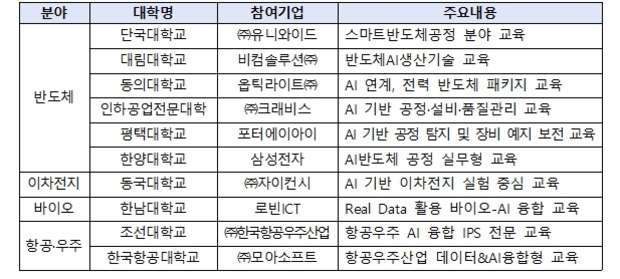 선정 대학은 첨단산업 인재양성 부트캠프 사업을 통해 구축한 대학-기업 협력체계를 활용하여, 첨단산업 분야별로 특화된 인공지능(AI) 융합과정을 운영하게 된다.