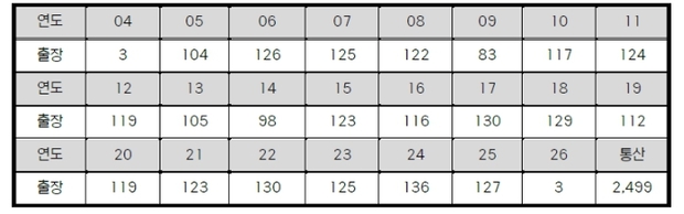![]() ▲ 삼성 강민호 연도별 출장 경기 수 |